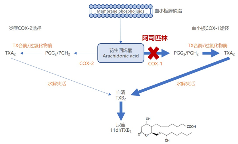 血管内皮细胞受损时,血小板受刺激而被激活,膜磷脂裂解而游离出花生四烯酸,在环加氧酶作用下生成前列腺素G2和H2(PGG2/PGH2),并进一步在血栓烷合成酶1(COX-1)的催化下生成血栓烷 TXA2。TXA2 有强烈的缩血管作用,还可通过结合血栓烷素血小板受体激活血小板,促进其聚集,从而发挥促血栓形成作用。低剂量阿司匹林即可有效抑制95%的COX-1活性及TXA2产生量。