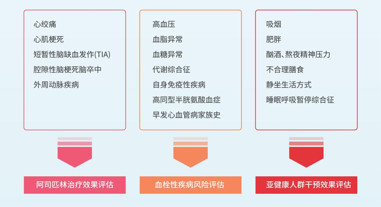 多项大型临床研究表明,心脑血管疾病患者阿司匹林治疗后的尿11-脱氢血栓烷B2水平可预测不良心血管事件的发生风险。心血管领域权威杂志《循环》发表的HOPE队列研究、前瞻性队列研究CHARISMA均表明:阿司匹林治疗后尿11-脱氢血栓烷B2浓度与严重心血管事件(中风/心梗/心血管死亡)风险的增加独立相关。中国医学科学院阜外医院进行的一项巢式病例对照研究发现,冠状动脉搭桥术后尿11-脱氢血栓烷B2升高与术后1年不良事件增加有关。