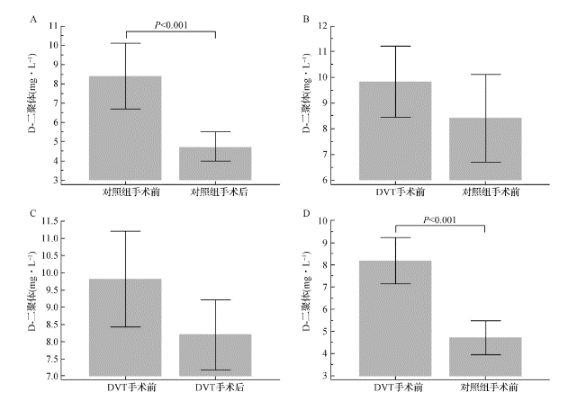 本研究利用病例对照研究发现:DVT 患者术后的 D-D 是高于非 DVT 患者的,而同一组患者的对比研究发现,常规术后抗凝治疗后,DVT 组 D-D 在手术前后的变化较小,一直处于高水平状态,而非 DVT 组,由于药物作用,术后 D-D 对比术前值有显著性降低。