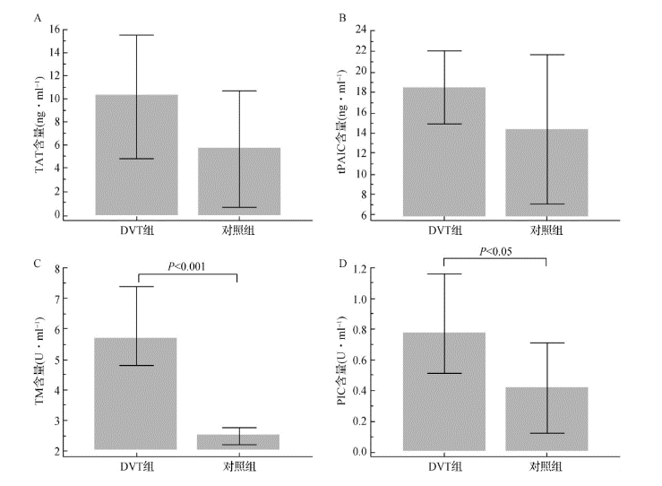 术前检测结果发现,术前血栓组的四个指标在 DVT 组表达均高于对照组,但是 TAT 和 tPAIC 在两组间无统计学差异( P > 0. 05) ,TM 术前在两组间存在显著性差异( P < 0. 001) ,PIC 在两组间存在差异( P < 0. 05) ,术后检测血栓组结果两组间对比以及术后血栓组之间的对比均无统计学差异 ( 结果未罗列)。