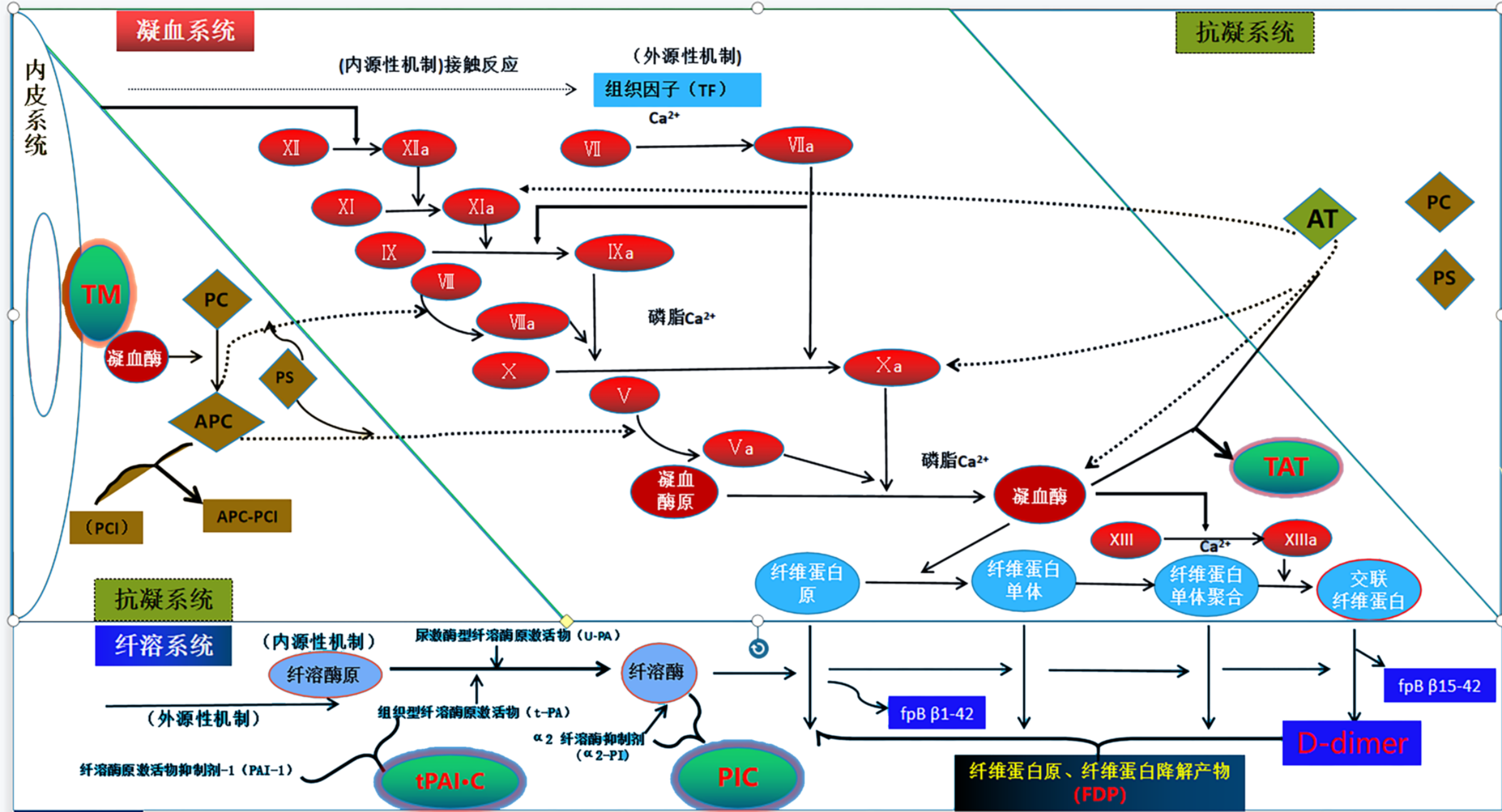 纤溶系统启动后,机体合成纤溶酶原,被内皮细胞合成的t-PA激活后转变成为纤溶酶,水解纤维蛋白及纤维蛋白原,其降解产物(FDP和D-二聚体)可在血液中被检测到。
